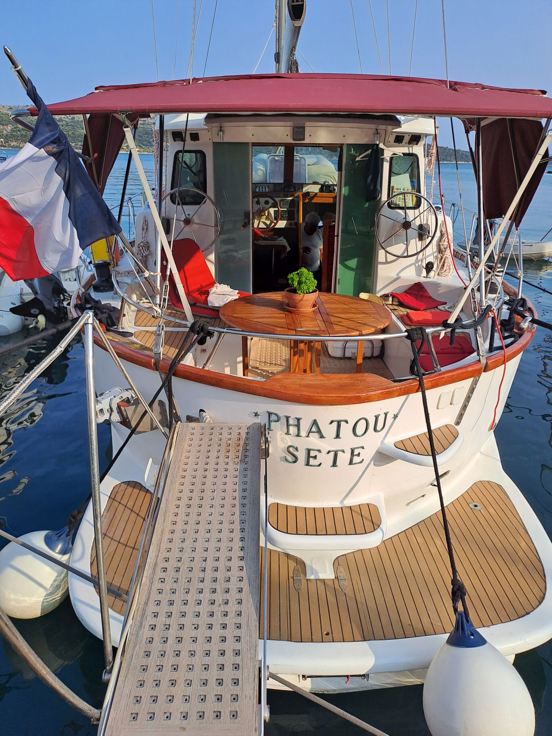 Trois postes de pilotage avec trois barres à roue 1 dans la timonerie et deux dans le cockpit arrière pour dégager le cockpit.