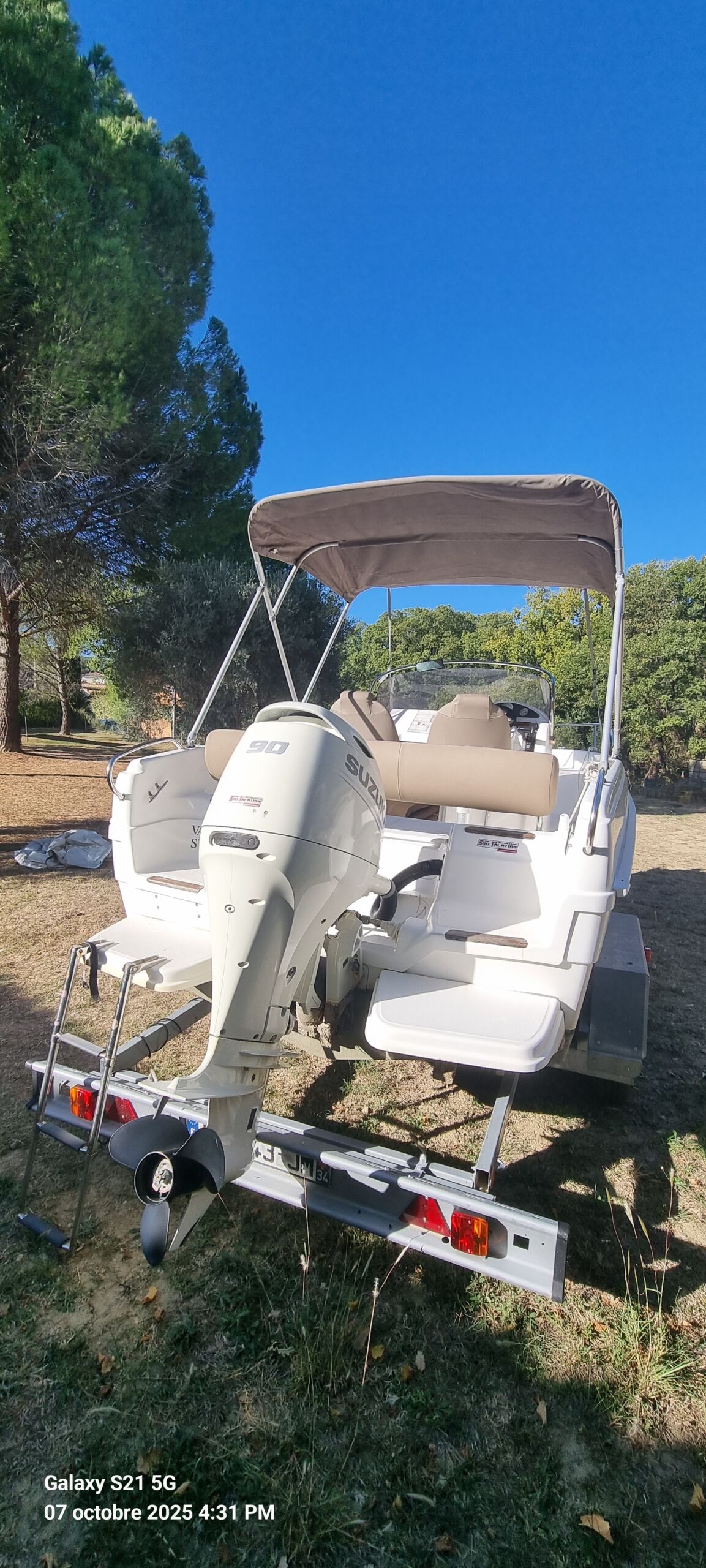 Open cap ferret 552 équipé 572, année 2017, comme neuf, moteur suzuki blanc 90 cv avec 175 heures seulement, remorque double essieux entièrement révisé. Cédée cause maladie.